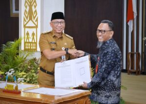 Bandar Lampung, — Gubernur Lampung, Rahmat Mirzani Djausal bersama Kepala Kantor Wilayah Badan Pertanahan Nasional (BPN) Provinsi Lampung, Hasan Basri Natamenggala menandatangani Naskah Perjanjian Hibah Daerah (NPHD), disaksikan langsung oleh Menteri Agraria dan Tata Ruang/Kepala BPN RI, Nusron Wahid. Penandatanganan berlangsung di Ruang Abung, Balai Keratun, Selasa (29/7/2025).