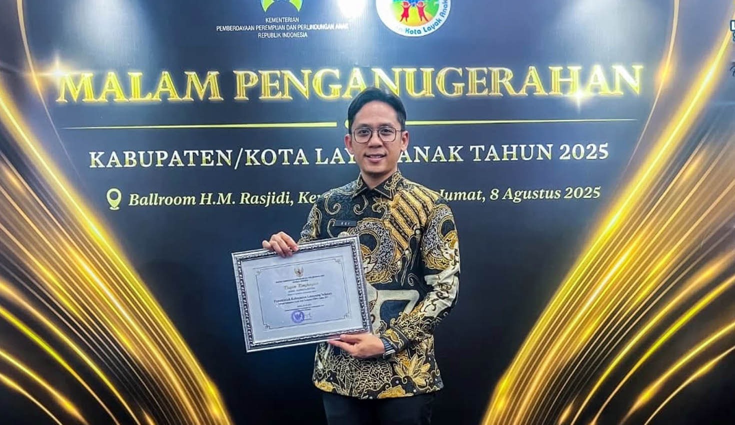 Penghargaan tersebut diterima langsung oleh Bupati Lampung Selatan, Radityo Egi Pratama, dari Menteri Pemberdayaan Perempuan dan Perlindungan Anak (PPPA) yang diwakili Wakil Menteri PPPA Veronica Tan, pada Acara Penganugerahan KLA 2025 di Auditorium KH. M. Rasjidi, Kementerian Agama RI, Jakarta Pusat, Jumat (08/08/2025).