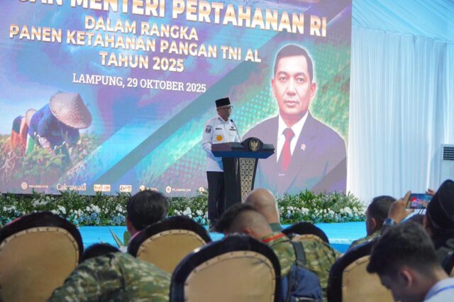 Hal tersebut disampaikan Gubernur saat mendampingi kunjungan kerja Menteri Pertahanan RI bersama Panglima TNI dan Menteri Pertanian RI dalam kegiatan Panen Ketahanan Pangan TNI Angkatan Laut di Prokimal-Kotabumi, Kabupaten Lampung Utara, Rabu (29/10/2025).