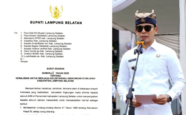 Kalianda, Mediatamanew.com.Bupati Lampung Selatan, Radityo Egi Pratama, resmi mengeluarkan Surat Edaran Nomor 24 Tahun 2025 tentang Kewajiban Menjaga Kelestarian Lingkungan Hidup di wilayah Kabupaten Lampung Selatan.