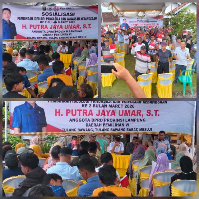 Tulang Bawang Barat-Mediatamanew.com-Anggota DPRD Provinsi Lampung Daerah Pemilihan VI yang meliputi Kabupaten Tulang Bawang, Tulang Bawang Barat, dan Mesuji, H. Putra Jaya Umar, menggelar kegiatan Sosialisasi Pembinaan Ideologi Pancasila dan Wawasan Kebangsaan (IPWK) tahap kedua pada bulan Maret 2026. Kegiatan tersebut berlangsung di Panaragan Jaya pada Minggu (8/3/2026).