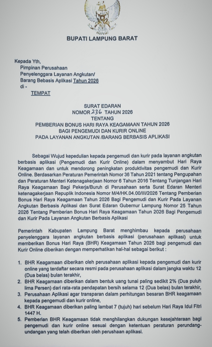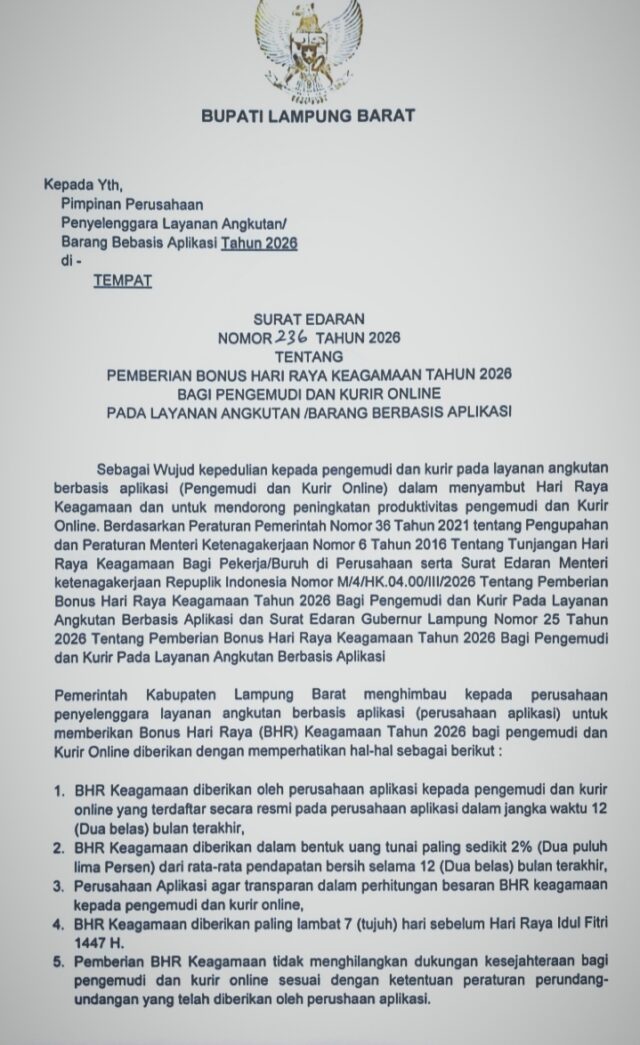 Kebijakan tersebut diterbitkan oleh Bupati Lampung Barat melalui Surat Edaran Nomor 236 Tahun 2026 tentang Pemberian Bonus Hari Raya Keagamaan Tahun 2026 bagi pengemudi dan kurir online pada layanan angkutan/barang berbasis aplikasi.