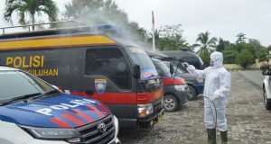 Polres Tulang Bawang Semprotkan Desinfektan Pada Kendaraan Dinas